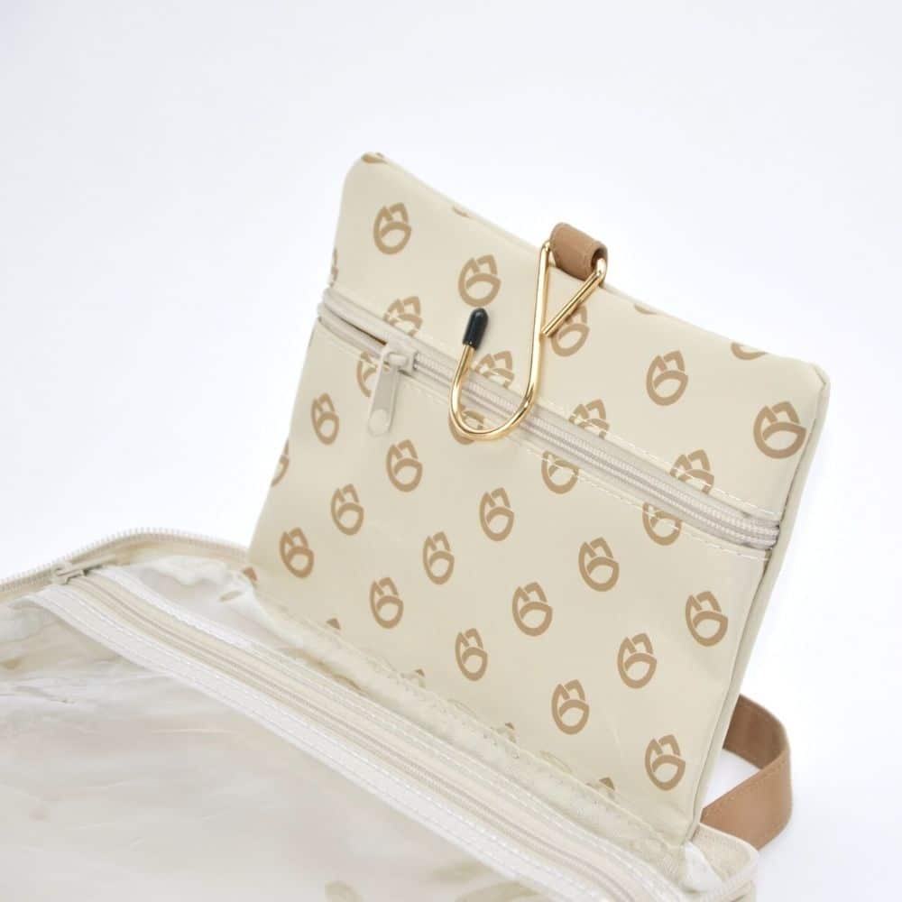 Kosmetyczka wyposażona jest w haczyk do zawieszenia w łazience, dzięki czemu dostęp do wszystkich kosmetyków jest niezwykle łatwy. Zawieszenie kosmetyczki ułatwia dostęp do trzech niezależnych przegródek wyposażonych w suwaki. Dwie główne przeźroczyste komory oraz mały organizer w górnej części.