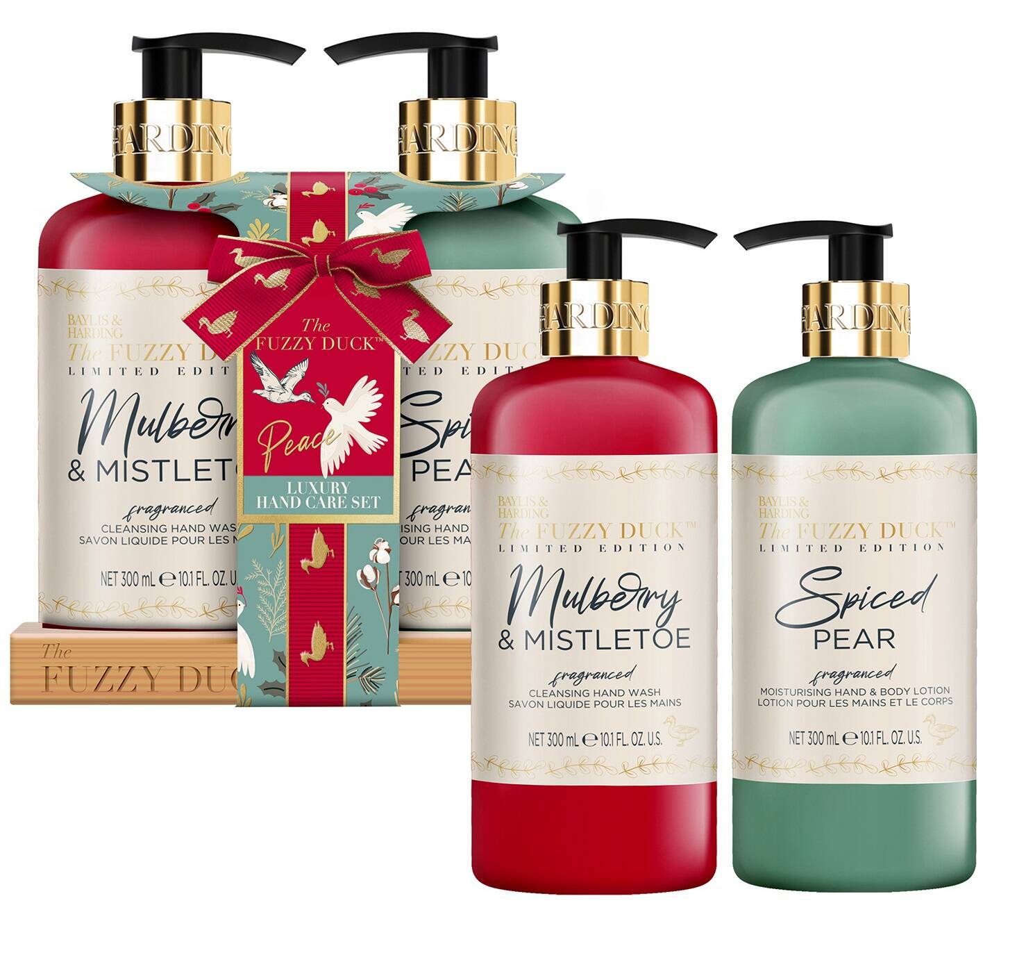 Zestaw do mycia rąk angielskiej firmy Baylis &Harding o zapachu inspirowanym aromatami Bożego Narodzenia.Zestaw na drewnianej podstawce zawiera płyn domycia ciała 300 ml, balsam do rak i ciała 300ml.doskonale nadający się do łazienki lub kuchni w plastikowym opakowaniu z dozownikiem ułatwiającym zachowanie czystości i prządku .Całość na drewnianej podstawce zapakowana w gustowne opakowanie umożliwiające  wykorzystanie  tego zestawu jako prezent.