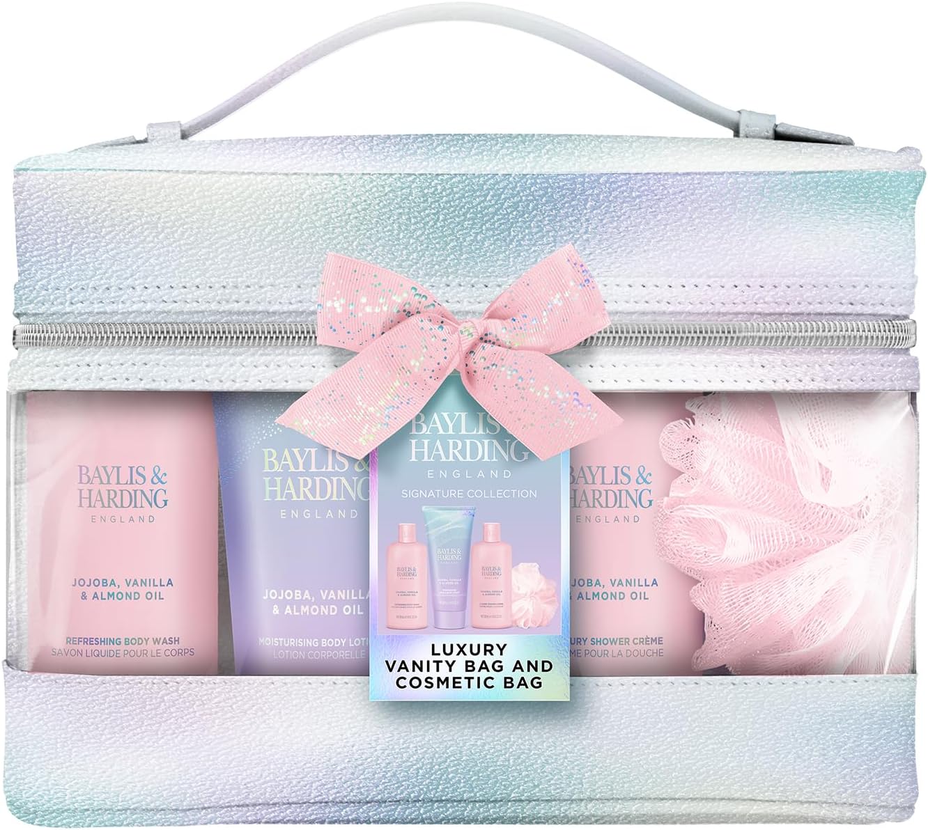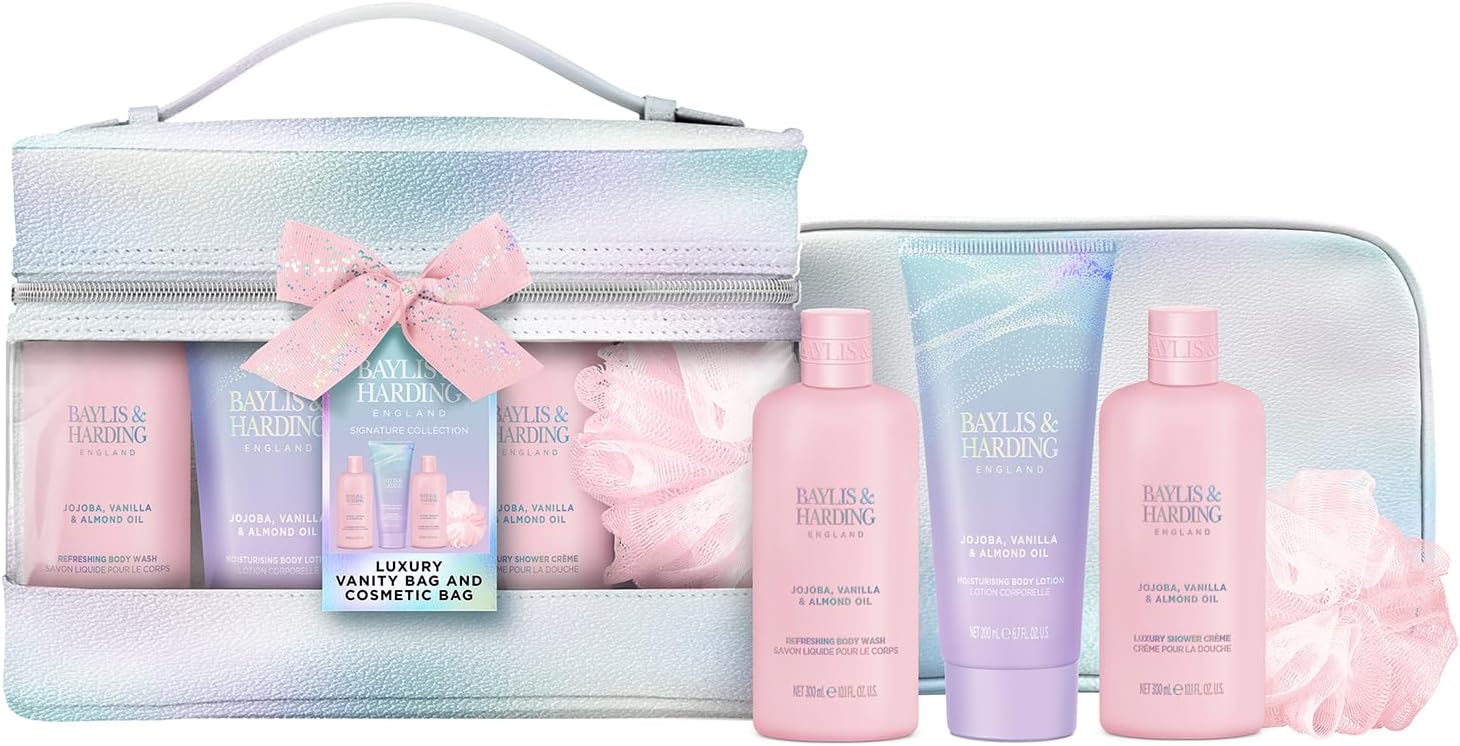 Angielski zestaw kąpielowy firmy Baylis & Harding o zapachu Jedwabiu Jojoby i Olejku Migdałowego w dużej kosmetyczce