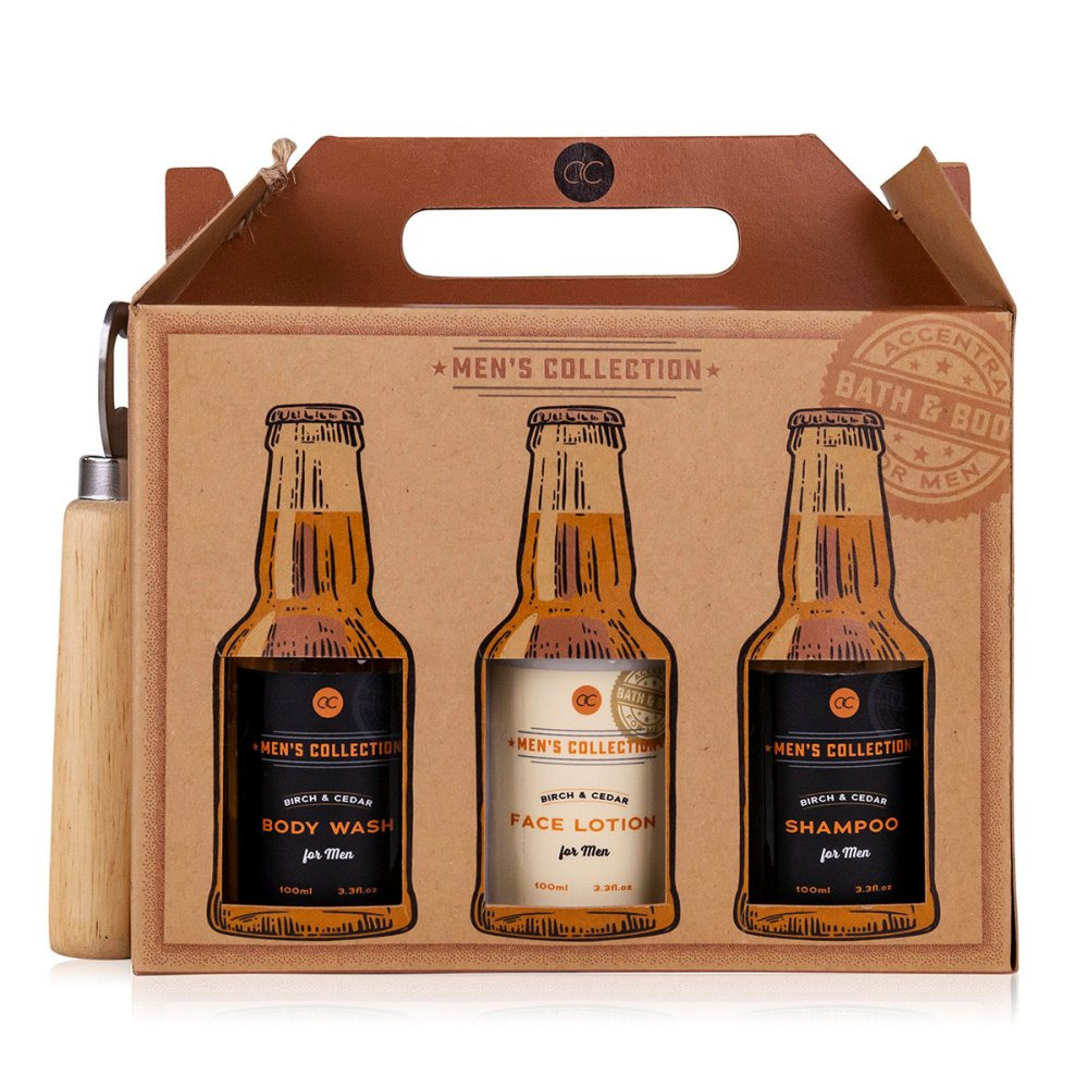 Zestaw upominkowy KOLEKCJA MĘSKA w sześciopakowym pudełku wykonanym z papieru kraft, zawiera 100 ml płynu do mycia ciała, 100 ml balsamu do rąk, 100 ml płynu do mycia twarzy, 100 ml balsamu do twarzy, 100 ml szamponu, 100 ml balsamu po goleniu, otwieracz do butelek z drewnianą rączką, zapach: brzoza i cedr, kolor: brązowy